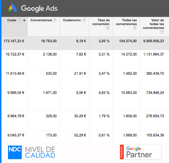 Los datos de nuestras cuentas de Google Ads nos avalan. Gestionamos la publicidad de todo tipo de clientes, desde los más pequeños a los más grandes.